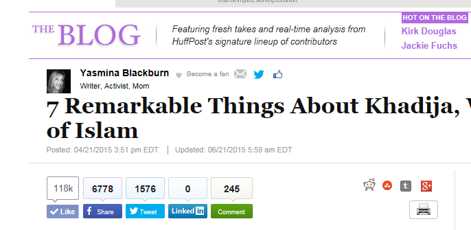 Thanks for the shares and making this article go viral! It’s been re-printed around the world and translated into French, German, Bosnian, Albanian and Indonesian. It was also voted one of the top 15 most moving blogs of Huffington Post Religion for 2015.  Mother Khadija was truly epic. May Allah (swt) be pleased with her. Please go out on HuffPost and post your comments! Thanks, Yasmina  7 Remarkable Things About Khadija, Wife of the Prophet of Islam